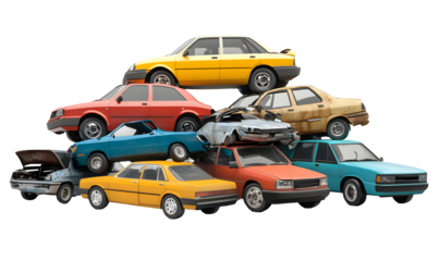 Old Rusty Junk Cars Stacked in Scrap Yard isolated on transparent white background, clipping path