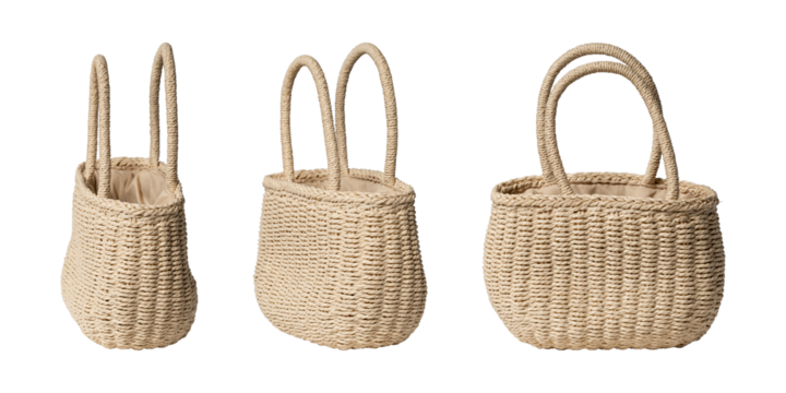 Set of handwoven natural jute basket tote bags isolated on transparent PNG. High quality studio shot.