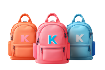 Blue backpack with a K logo surrounded by pink and orange school bags on a transparent background PNG.png