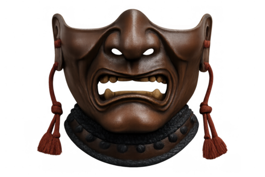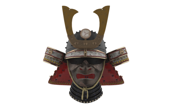 Highly detailed 3d rendering of a menacing samurai mask with a fierce expression, isolated on a transparent background