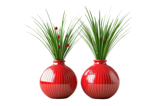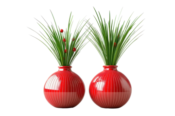 Decorative Kadomatsu display for New Year's celebration featuring vibrant red vases and festive greenery