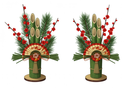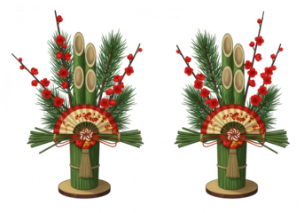 Two traditional japanese kadomatsu new year s decorations with pine bamboo and plum blossoms isolated on transparent background