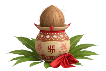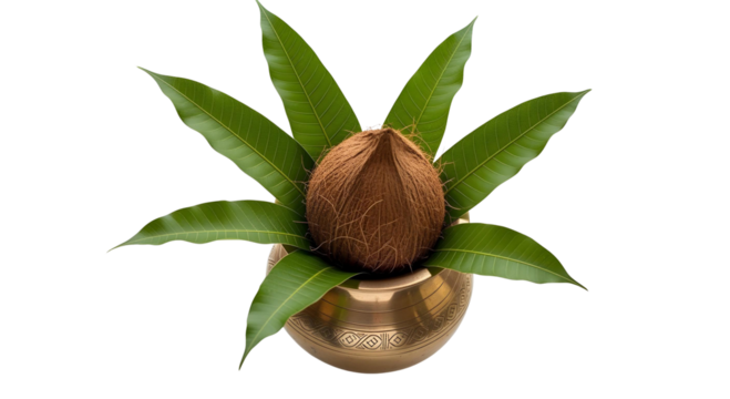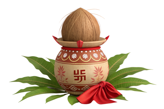 traditional durga puja kalash with coconut and leaves in png