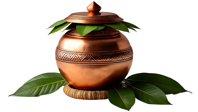 Copper Kalash with Mango Leaves and Coconut, Isolated on transparent Background