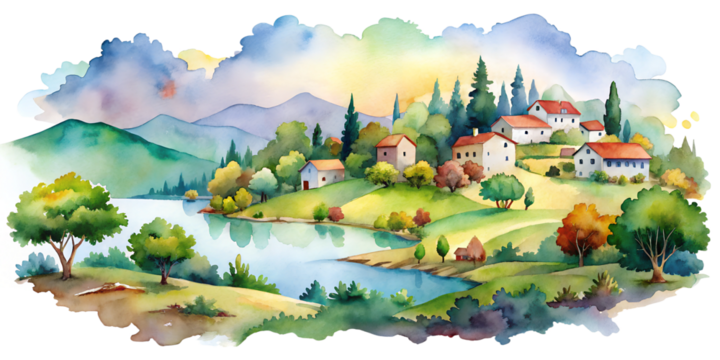 Scenic watercolor illustration of a village by a lake, with hills and trees, serene landscape art in vivid colors, transparent PNG file