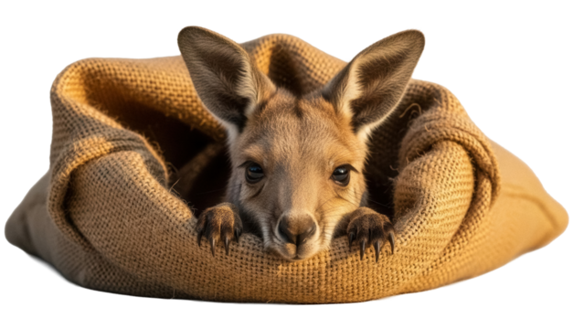 Adorable baby kangaroo joey in a burlap sack isolated PNG, cute animal portrait on transparent background