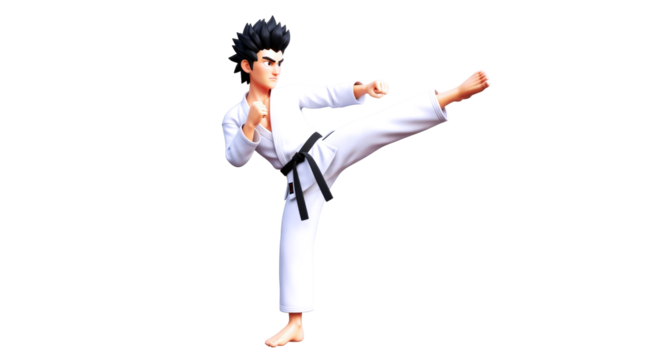 3d cartoon karate master dynamic high kick, focused power, martial arts, isolated on transparent background