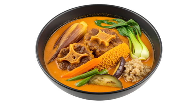 A Rich Bowl of Filipino Kare-Kare Oxtail Stew in a Creamy Peanut Sauce on isolated transparent background