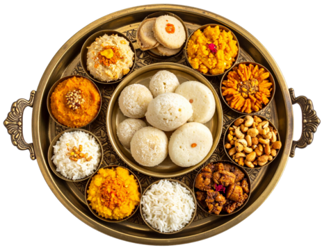 Assamese Magh Bihu Feast Spread with Pitha and Laru on Brass Thali, PNG Isolated