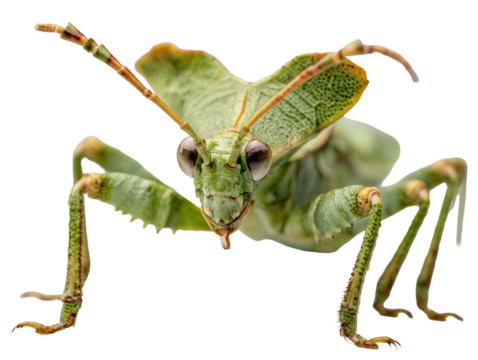 Green grasshopper insect standing, detailed macro view of tettigoniidae katydid on transparent background