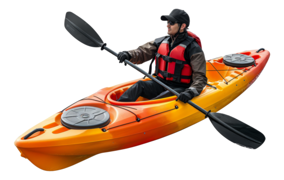 Man kayaking in orange kayak with paddles, cut out - stock png.