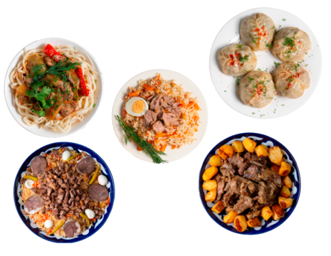 central asian cuisine manty, plov, kuyrdak, lagman, beshparmak, kazakh cuisine dishes png, kazakh cuisine set