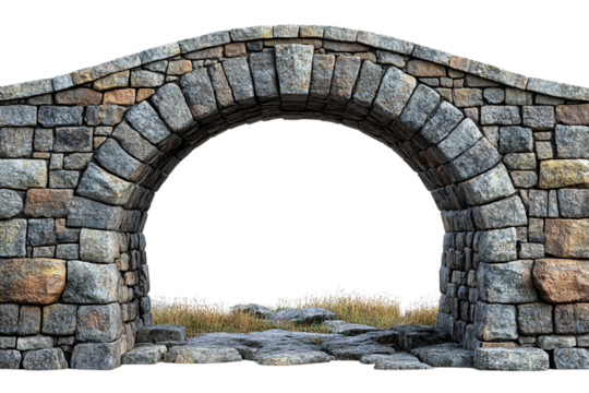 Short stone arch bridge over grassy field with natural rocks and soft curve at top, isolated on a transparent background