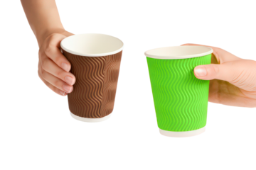 Two Hands Holding Up Disposable Coffee Cups in Brown and Green With Textured Surfaces Showing Concept of Sharing With Transparent Background Isolated
