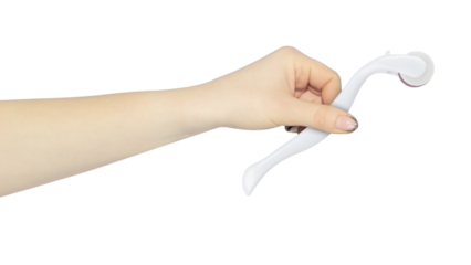 Smiling woman relaxing with warm beverage in festive sweater, transparent background