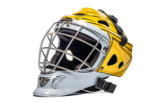 A goalie mask with a yellow and silver helmet, ready for action on the ice