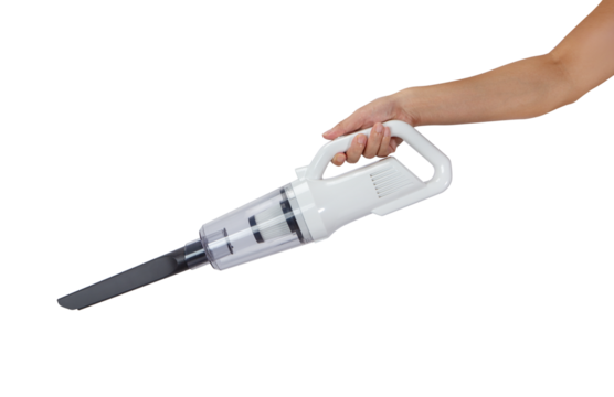 Young woman cleaning floor with gloves and cleaning supplies on transparent background