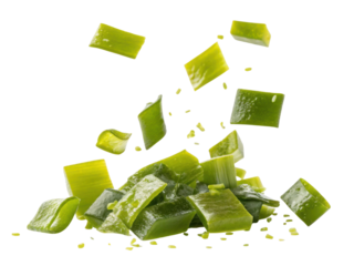 Fresh kelp pieces are beautifully scattered, showcasing their vibrant green color and unique texture, perfect for culinary creations