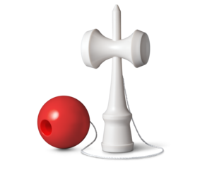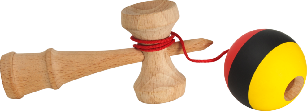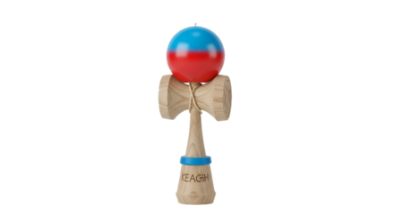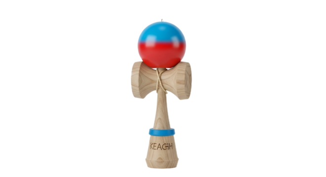 A modern kendama with a polished wooden ball, isolated on a empty plain background