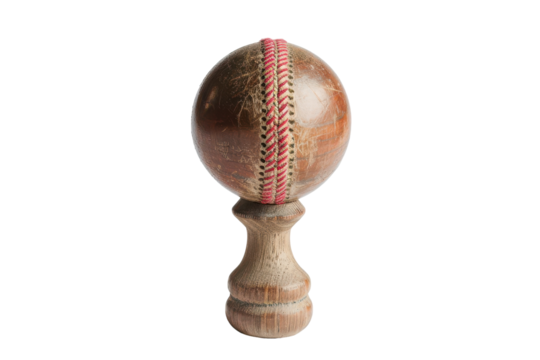 Unique wooden kendama with a hand-crafted ball featuring traditional stitching displayed on a minimalist surface