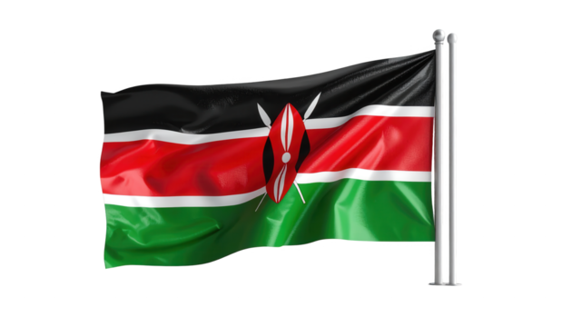 The kenyan flag flutters proudly in the wind isolated on transparent background