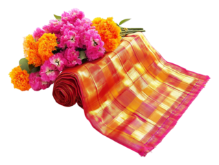 Kanjeevaram Sarees with a Garnish of Flowers, Perfect for Traditional Wear, Isolated on a Transparent Background
