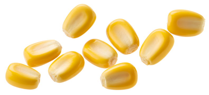 Ripe corn kernels falling on transparent background