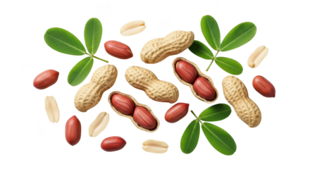 Raw Peanuts In Shells Shelled Kernels And Green Leaves Against Background image