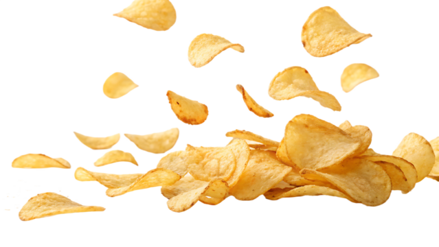 Falling kettle potato chips isolated on a white background PNG. AI GENERATED.