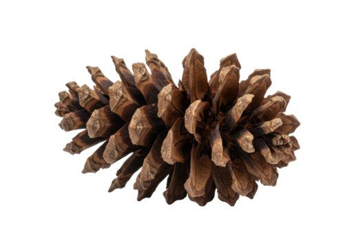 perfectly preserved ponderosa pinecone with rich sienna brown texture, captured via macro high key focus stacking on a pure white background with vast copy space. concept of seasonal rustic elegance