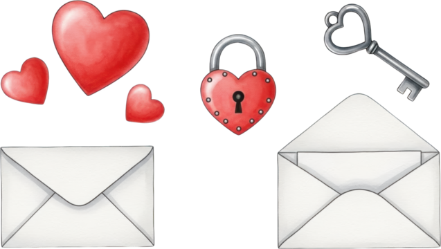 A watercolor illustration featuring various romantic symbols including red hearts a heart shaped padlock a silver key and open and closed white envelopes love romance valentine