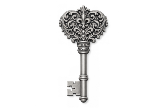 Ornate silver skeleton key with heart-shaped bow and vintage filigree design unlocking secrets and access