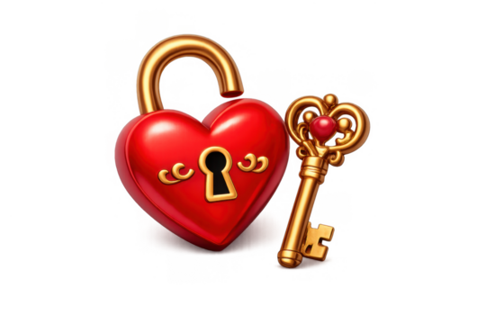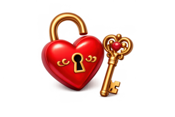 Red heart with ornate key on transparent background illustrating love