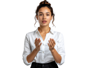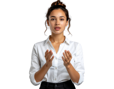 Female TED-style speaker standing with expressive hand movement and focused face, high detail skin and shadow, isolated on a transparent background, PNG