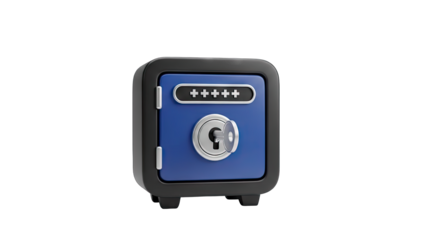 Blue Metal Safe with Black Trim and Silver Keyhole and Numeric Keypad Illuminated by Soft Studio Lighting on a Transparent Background