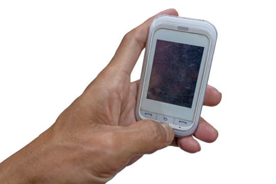 Hand Holding an Old White Mobile Phone with Scratched Screen Isolated on Transparent Background