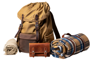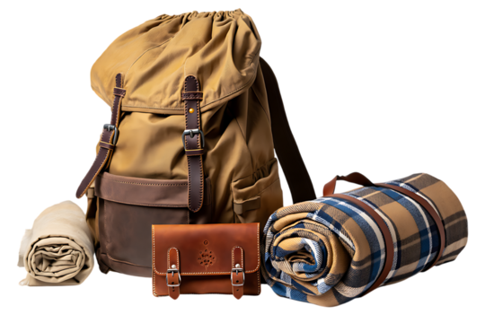 Classic khaki canvas backpack with leather details, a small brown pouch, and rolled plaid blankets for travel essentials.