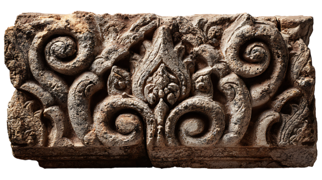 Cambodian Angkor-style stone relief carving fragment with ancient motifs, isolated on a white background
