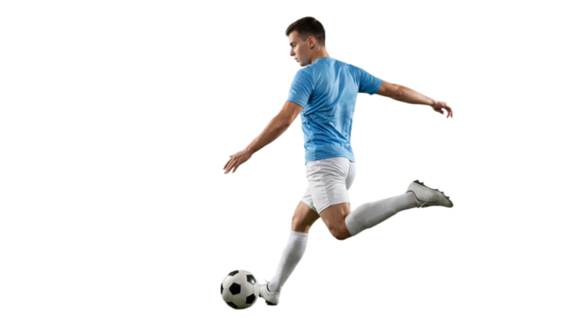 Football player in blue kit kicking ball on transparent background