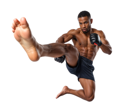Focused martial artist in karate kick on transparent background