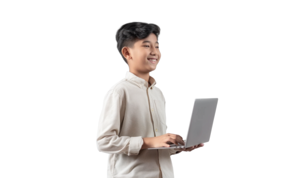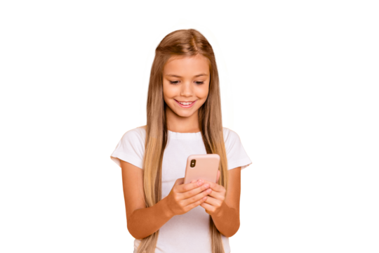 Child holding a tablet device, gray sweater, digital screen ready for use, white isolate background.