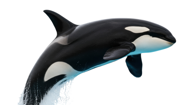 Orca whale jumping out of the ocea, water splashing around, isolated on a transparent background