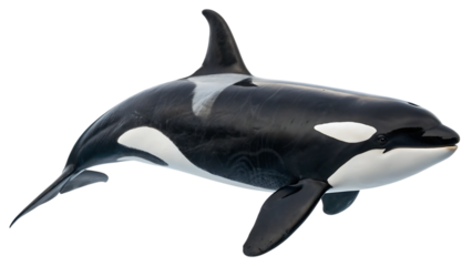 Majestic Killer Whale (Orcinus Orca) Swimming with Detailed Black and White Markings isolated on a white background, cutout, PNG.
