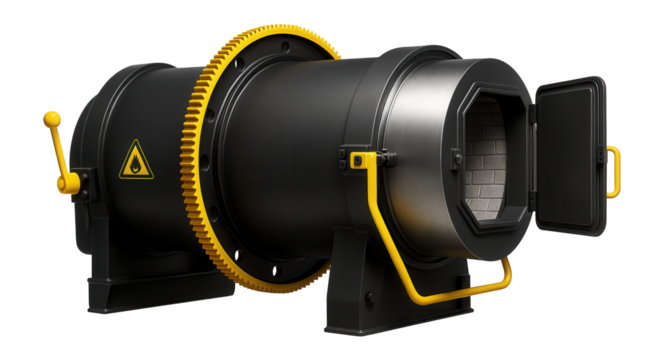Rotary kiln incinerator with refractory lining and a rotating drum for waste management in an industrial facility.