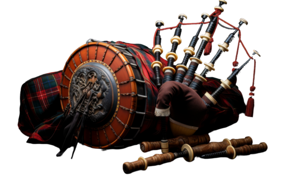 A man in a kilt rests on the ground beside a bagpipe, lost in the music he creates