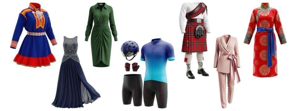 A collection of different clothing, including a kilt, a cycling outfit, and traditional Mongolian and Sámi folk dresses