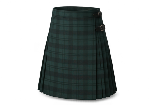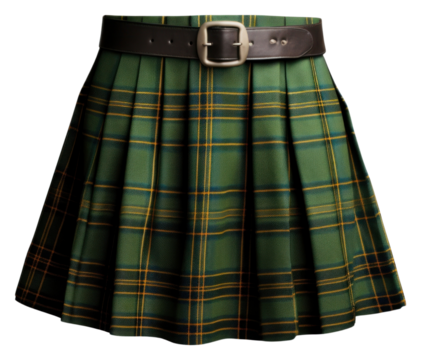 Dark green tartan kilt, pleats, buckles, isolated on transparent background.