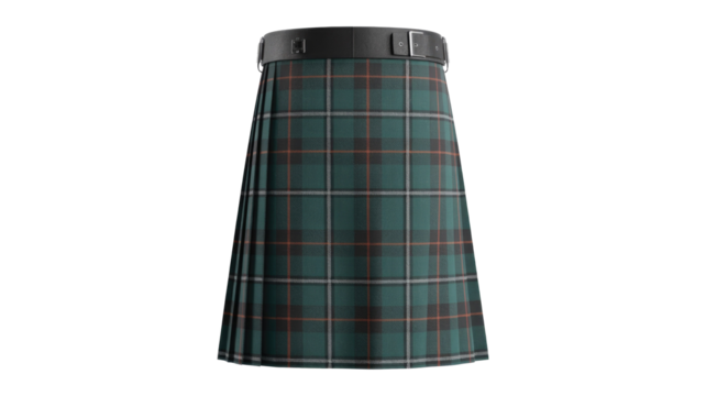 A traditionally pleated Scottish kilt featuring a dark green tartan pattern with black, orange, and white lines, secured by a black leather belt. background removed