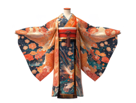 Ornate kimono with floral and bird designs displayed on a mannequin against isolated on a transparent background