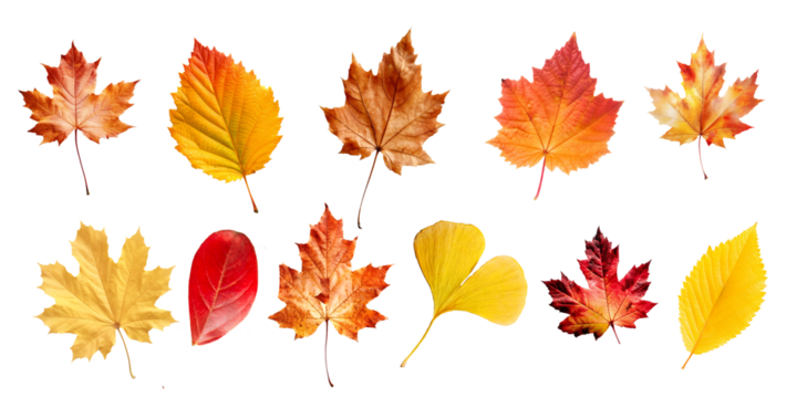 Collection set of many colorful vibrant different kind leaves in autumn, isolated on white or transparent background, fall season, png file